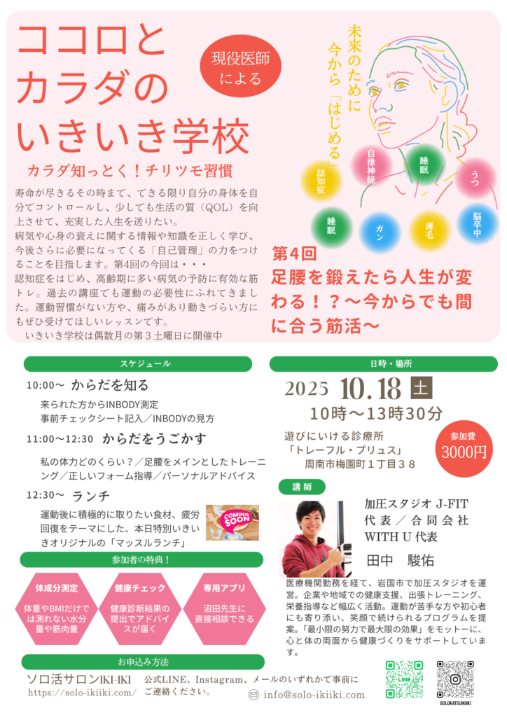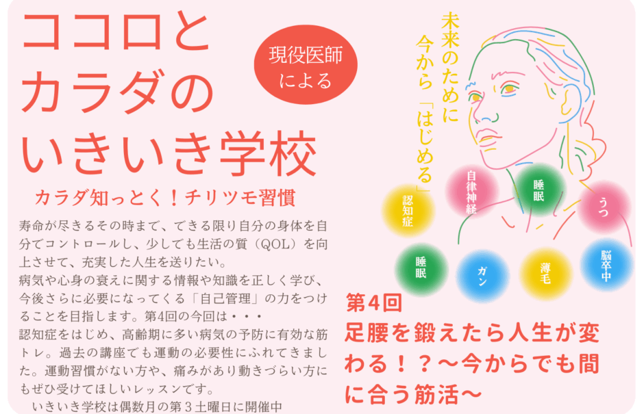 第37回 予防医療を知る、ココロとカラダのいきいき学校 VOL.4 「足腰を鍛えたら人生が変わる!? ~今からでも間に合う筋活~」開催のご案内~